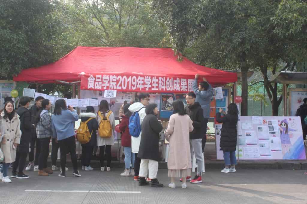 为深化食品学院创新创业教育建设,加强学生创新思维和创业能力的培养,充分展示学院优秀创新创业成果,12月6日中午,食品学院在于二区主干道上举办2019年学生科创成果展,吸引到近百余名学生到场观摩。