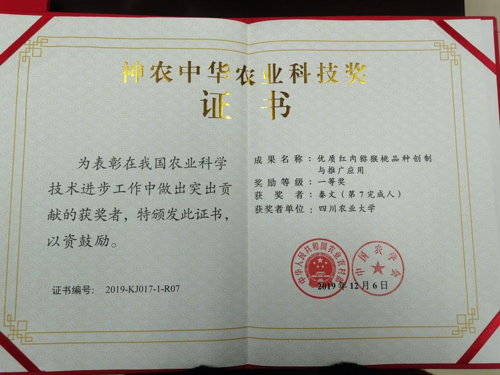 据悉,由秦文教授率领的猕猴桃贮藏保鲜及品质评价关键技术项目发表SCI论文4篇,单篇最高影响因子4.784,参与该平台项目主持单位四川省资源院申报的“优质红肉猕猴桃品种创制与推广应用”获得2019年神农中华农业科技奖一等奖(排名第7)。