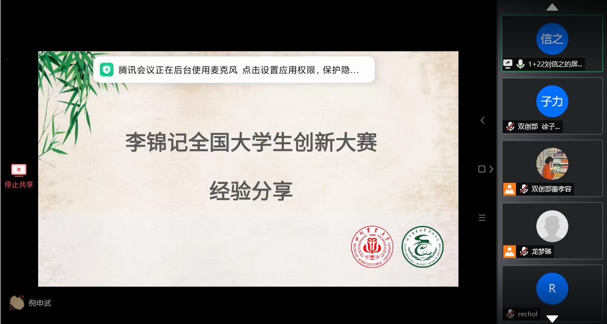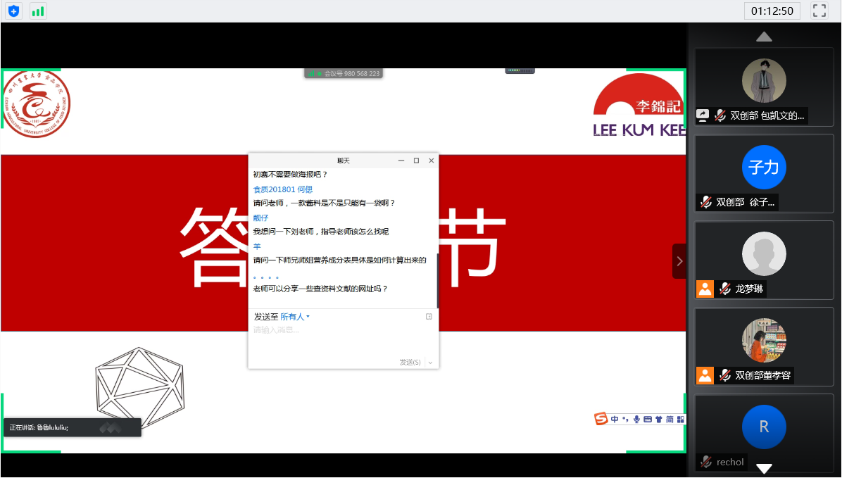 为激发同学们的创新创造精神,实现理论与实践的结合,5月10日下午4点,2020年度李锦记杯学生创新大赛宣讲会于腾讯会议举行,食品学院团委刘燕苹老师,往届获奖团队代表马仁泽、刘信之和各年级各专业学生近130人参会。