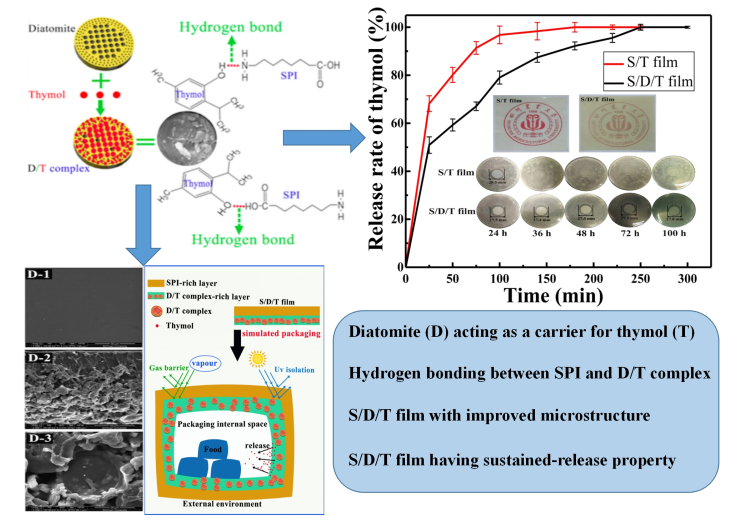 该研究创新性地利用多孔性的硅藻⼟负载抗菌性能优异、易挥发的百⾥酚精油制备抗菌复合体(D/T complex),并与⼤⾖分离蛋⽩复合,获得了具有缓释抗菌功能,且力学和阻隔性能优异的新型食品包装膜,为蛋白基可食性膜功能化改性和食品包装应用提供理论依据。