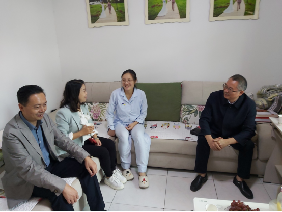 2020年9月29日,食品学院工会主席、党委书记曾小波,党委副书记侯维,行政办主任陶永清等,一行专程前往看望慰问产后的女职工沈黎。
