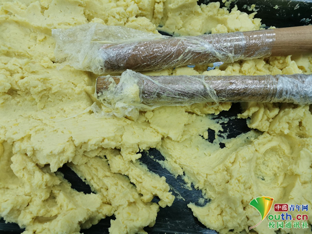 将蒸好的绿豆打成粉末并与桂花糖水搅拌均匀用于制作馅料。中国青年网通讯员 田彬琳 供图