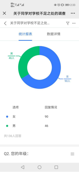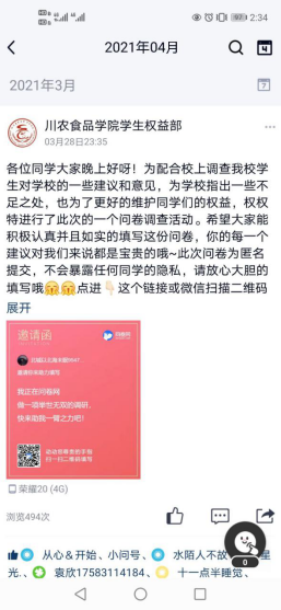 活动分为前期部门内部小范围收集信息以及后期于全校范围收集信息两部分,于食品学院权益部官方QQ进行活动宣传,活动制作的问卷内容主要包括食堂、学校热水、住宿等几大问题。本次问卷调查面向全校各学院各级学生,共收到136份有效回复,其中包括多个学院各年级学生,反馈情况总体有效,除问卷本身设置问题外,收集到6类同学反馈问题。目前收到的有效反馈已经整理成文件上报学校。