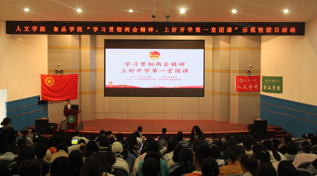 3月27日,食品学院团委和人文学院团委于逸夫楼小礼堂联合举办了以“学习贯彻两会精神,上好开学第一堂团课”为主题的示范性团日活动。食品学院学生会执行主席张浩然、人文学院学生兼职团委副书记张蒙茜应邀出席。两院共计近400名团员青年参与此次活动。