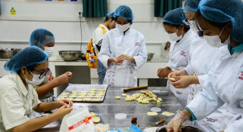 食品学院自2014年起为新生制作月饼至今已有8年,本次月饼制作计划从暑假期间就开始策划。由于纯手工酥皮月饼保质期只有5天不能提前制作,为了保证效率,学院社会实践与志愿服务建设中心招募了近30名志愿者,经过烘焙俱乐部专业培训合格后“持证上岗”。参与制作的大二老生们表示,在去年入学的时候,吃到了师兄师姐们亲手做的月饼,当有机会参加月饼制作时便主动报名,不仅体验了一次劳动教育,更希望能把学院的食品文化传承下去。
