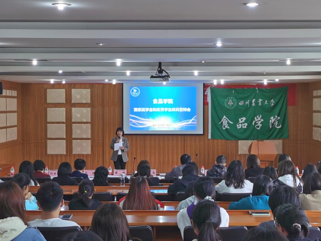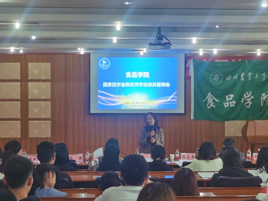 10月12日下午,食品学院在逸夫楼第二报告厅举行国家奖学金和优秀学生标兵答辩会。来自学院3个专业的8位候选人在答辩中一展风采。党委书记秦文教授,副院长张志清教授,学院党委副书记侯维老师,食工系主任李美良副教授,食质系系主任陈洪教授,学院党委办公室主任兼团委副书记张丽娜老师,学院行政办公室主任程瑶副教授,学院党委办公室副主任兼团委副书记彭小芮老师,学院团委办公室邓又天老师、陈放老师及学生代表担任评委,百余名学生到场观看8位候选人的精彩答辩。
