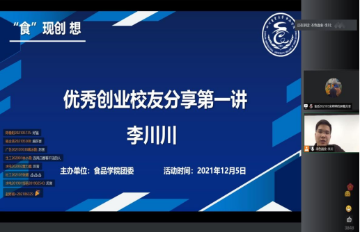 12月5日,由食品学院“创未来”双创辅导员工作室、食品学院团委创新创业中心联合主办的“‘食’现创想”创业校友分享会正式启动。活动邀请了全国“大学生创业英雄年度100强”优秀创业校友、成都本色食代面业有限公司营销总监李川川做了题为“唯有临在当下,方能走向未来”的线上讲座,吸引了1300余名同学聆听,互动弹幕超3000条。