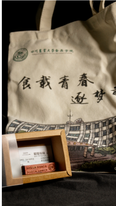 定制车票+印章——食品学院是梦绽放的摇篮。帆布袋“食载青春 逐梦前行”装上行囊,承载着满满的祝福,装满送给毕业生们的礼物。拾起定制车票开始新的旅程,每一枚印章都镌刻着我们成长的印记。