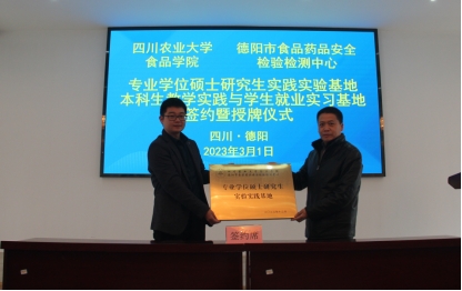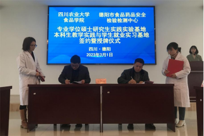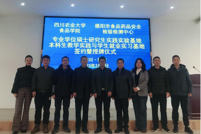 3月1日,食品学院副院长张清教授、食品质量与安全系副主任刘爱平副教授、食品科学与工程系崔强博士、院科技开发办公室邓又天一行,前往德阳市与食品药品安全检验检测中心签订本科教学实践及就业实践基地协议和专业学位硕士研究生实验实践基地并授牌。德阳市市场监督管理局副局长田涛,食品药品安全检验检测中心主任金卫,副主任张娴、董洋利,高级工程师潘志明出席签约暨授牌仪式。