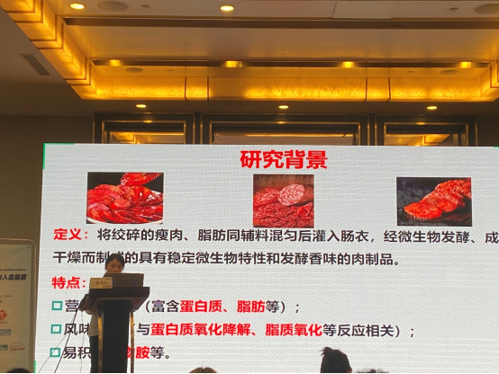 会上,方正锋以“猪肉安全及营养健康的脂质调控”为题作特邀报告。他指出影响当前我国猪肉产业链高质量发展的两大难题,PSY少等导致的产肉效率低和猪肉脂质含量高以及组成不平衡导致的高脂饮食,率先提出脂质调控是提高生猪产肉效率和猪肉品质的关键突破口,并系统总结了食品学院动物营养与肉品加工交叉学科创新团队二十年来以脂质调控为突破口围绕上述两大产业难题所做的创新工作和取得的突出成果。团队博士研究生裴慧洁做了“脂质氧化对发酵香肠中蛋白质降解及生物胺形成影响”的学术报告,分享了脂质氧化对发酵香肠风味形成以及加工危害物形成的调控规律。
