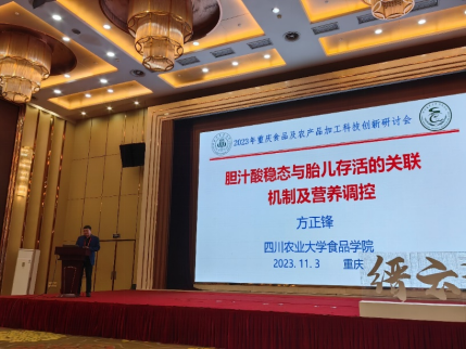 方正锋在“缙云狮峰·狮峰智汇研讨会”作了“胆汁酸稳态与胎儿存活的关联机制及营养调控”的专题报告,报告针对妊娠性胆汁淤积被视为孕妇常见肝脏疾病的重要问题,以猪为模型,系统阐述了胆汁淤积与胎儿结局的关系,解析了妊娠性胆汁淤积的分子机制,并从胆汁酸受体靶向调控、肠道微生物和营养干预等方面探讨了胆汁酸稳态的干预策略。秦文受邀在“西大食品40年·学术研讨会”分会主持,共话“西南食品”美好未来,后续将继续拓展校友工作、多开展校友活动、将校友资源融入人才培养全过程。