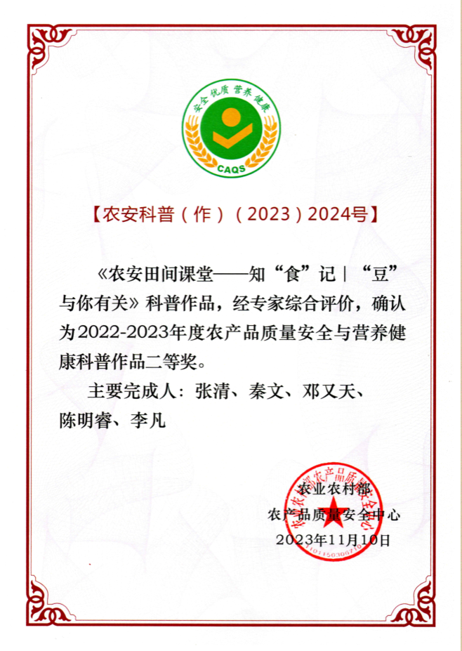 我院秦文教授、张志清教授、张清教授、申光辉副教授、陈明睿博士、侯晓艳博士等牵头申报的《农安田间课堂—知“食”记|“豆”与你有关》和《农产品质量安全宣传手册》2项农安科普作品荣获“2022-2023年度农产品质量安全与营养健康科普作品”二等奖。据悉,《农安田间课堂—知“食”记|“豆”与你有关》聚焦粮食安全领域的“大豆原料安全”,采用微信推送的形式围绕大豆生产,深入田间地头,讲述了大豆在人民日常生活中的地位、需求短缺与进口情况、如何破解长期以来大豆自给率偏低的困境,以及大豆玉米带状复合种植技术的起源、原理和示范推广等情况。以深入浅出、贴近实际的方式向观众讲述了tyc5997太阳集团在破解“卡脖子”问题上所作的一线工作。《农产品质量安全宣传手册》聚焦“食品生产全产业链安全防线”采用宣传册的形式简明扼要介绍了《农产品质量安全法》和《农药管理条例》、《兽药管理条例》的主要内容;介绍了近年来发生的重大食品安全事件,使社会公众进一步增强农产品质量安全意识,食品生产经营者深刻认识到质量是生命线、法律责任是生存之本,消费者学习维护自身合法权益,共同营造农产品质量安全的生产环境和氛围。