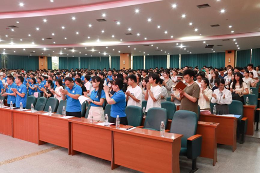 会议的最后,党委办公室辅导员陈放携手学院演唱团与在场全体师生一同合唱学院院歌《川农食品人》,将本次大会推上高潮。正如歌词所言:“只要我们都携起双手来,食品人的明天更美好”。与会人员纷纷表示,将铭记这份期望,不负重托,踔厉奋发,在川农大这片沃土上精心浇灌梦想,迎接更加辉煌的明天。至此,食品学院2024级新生大会圆满结束。