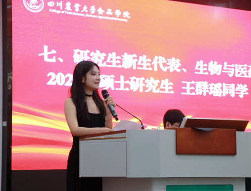 研究生新生代表、生物与医药专业2024级硕士研究生王群瑶和本科新生代表、食品质量与安全专业2024级学生马粲然在发言中先后讲述了初入川农的心路历程,表明了即使屡战屡败,也绝不言弃的决心与信念。两位学生代表一致认为,作为川农的一员,既要仰望星空,心怀远大理想,又要脚踏实地,在追求真理的道路上不懈探索。新一代食品人将继续怀揣赤子之心,以勤勉和自强不息的态度对待学习和生活;谨记食品人的责任与使命,坚定信念,迎接充满无限可能的未来,勇敢地迈向每一个新的高峰。