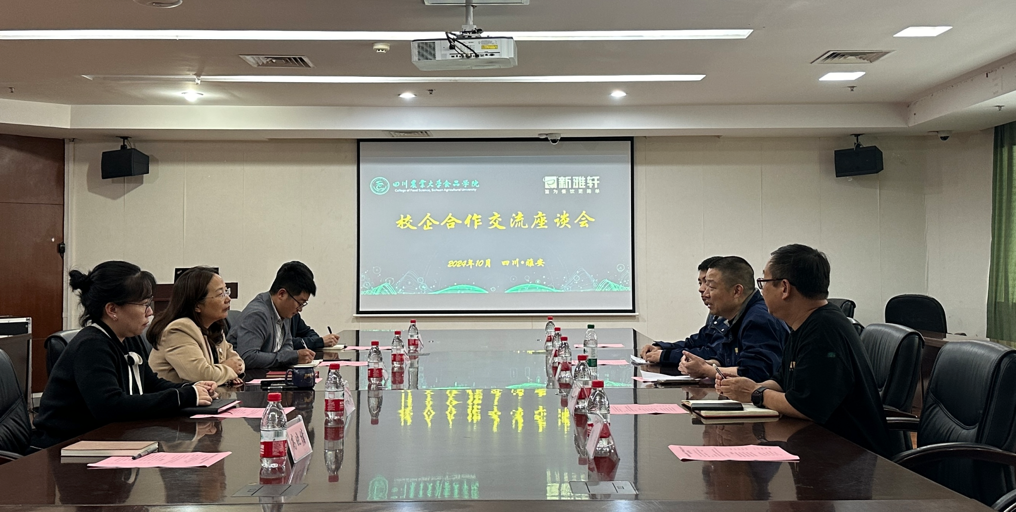 为进一步加强校企融合,更好地发挥校企双方资源优势,推进校企协同育人,促进产教协作,服务行业发展,10月30日下午,食品学院与四川新雅轩食品有限公司在综合楼214开展校企合作交流会。四川新雅轩食品有限公司副总裁周春明,总经理嘉斌、高级主管喻刚,学院党委书记秦文,副院长张清,党委副书记、纪委书记汤瑞瑞出席会议。会议由汤瑞瑞主持。