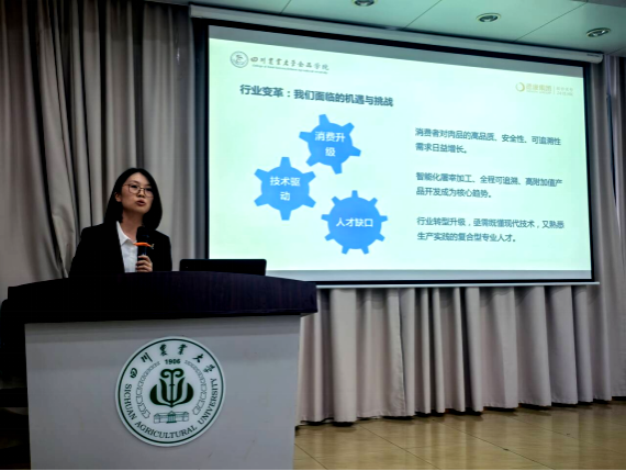 开班仪式上,德康集团生鲜品事业部人力资源负责人周静就“德康菁英班”项目背景、培养目标及课程体系作了详细介绍。她表示,菁英班旨在通过“学业导师+产业导师”双轨制培养模式,为学生提供专业知识、职业规划、生产管理等多维度学习内容,推动理论与实践的深度融合。