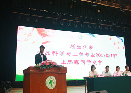 最后,学生代表王鹏霖同学发言。他代表全体新生讲述了他们对大学生活的憧憬和学习目标——他们将从这里眺望世界、走向未来。他表示:从今天起食品学院是大家共同的家,共同的舞台。他们将牢记川农大“追求真理、造福社会、自强不息”的校训,弘扬“爱国敬业、艰苦奋斗、团结拼搏、求实创新”的川农大精神。