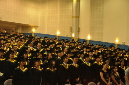 毕业典礼暨授位仪式在全场师生齐声高唱《歌唱祖国》音乐声中结束。