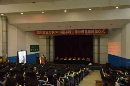 典礼在激昂澎湃的《义勇军进行曲》中拉开帷幕。学院院长,学位评定分委员会主任蒲彪代表学院向顺利毕完成学业的2014届本科毕业生们表示衷心地祝贺,感谢毕生们在四年的光阴里对学院工作的关注与支持,并向为同学们的成长而辛勤工作的教职工们致敬。他还向毕业生提出了三点恳切希望,一是爱岗敬业、踏实工作,继续发扬“爱国敬业、艰苦奋斗、团结拼搏、求实创新”的川农大精神。二是鼓励毕业生勤于学业、努力实践、学会团队合作。三是希望毕业生走出校园后,继续关心、关注母校的建设和发展,支持和宣传食品学院,使母院发扬光大。最后,蒲院长的一句“愿毕业生们在新的道路上身体健康、爱情美满、鹏程万里”将现场气氛推向高潮,全场立即响起了雷鸣般的掌声,久久不能平息。