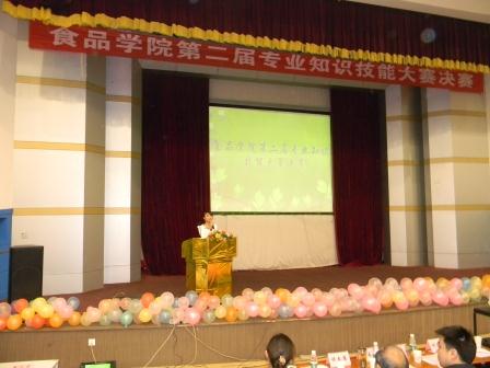 4月10日晚,食品学院第二届专业知识技能大赛决赛在逸夫楼小礼堂举行。出席大赛的嘉宾有校党委学工部部长、学生处处长李武生、食品学院党总支书记王惠燮,食品学院副院长李诚、食品学院资深教授陈一资、教务处实践教学管理科科长母贵琴等领导和老师出席大赛并担任评委,来自全校的400余名师生现场观看了比赛。