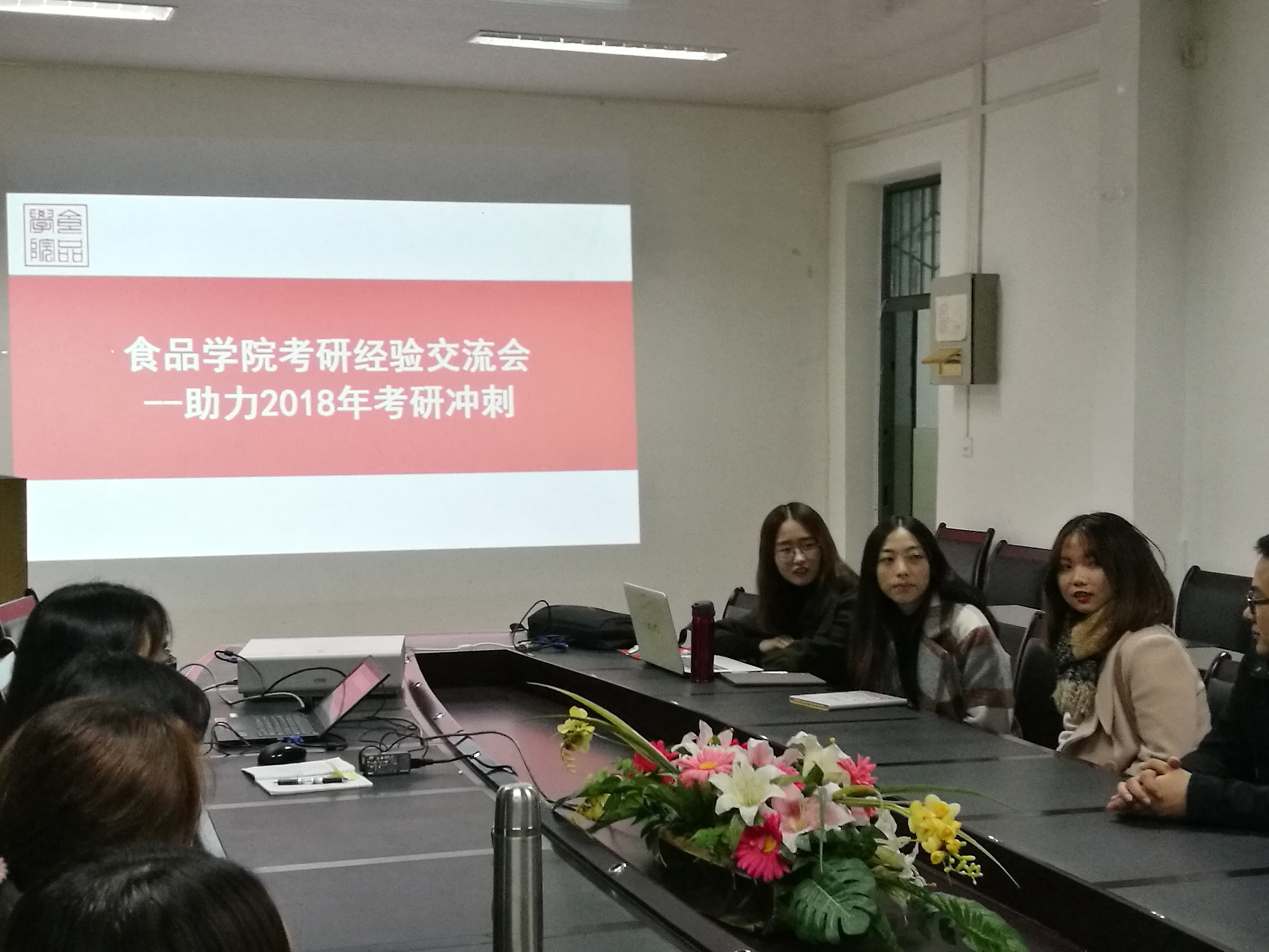 2017年11月23日晚上七点食品学院在第三教学楼206会议室举办了“食品学院考研经验交流会——助力2018年考研冲刺”,此次交流会在考研前一个月举行,目的是帮助同学解决考研冲刺中遇到的困难,调动考研激情,缓解考前焦虑,让同学们以饱满的热情、必胜的信心和科学的方法面对考研“决战”。