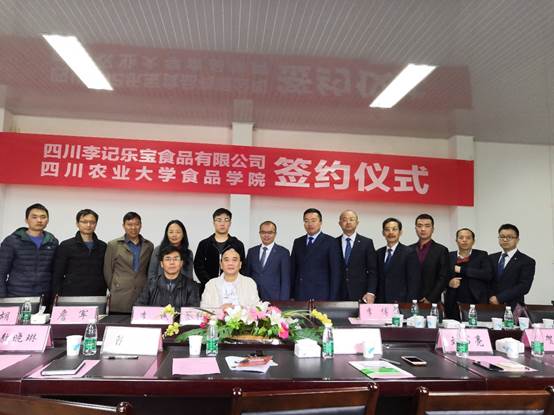 11月8日,食品学院与四川李记乐宝食品有限公司在第三教学楼206会议室举行签约仪式。食品学院院长李诚,副院长、食品加工与安全研究所所长秦文,研究所刘书亮教授等6位教师,以及四川李记乐宝食品有限公司董事长李国斌、副总李博等9位公司领导参加了签约仪式。