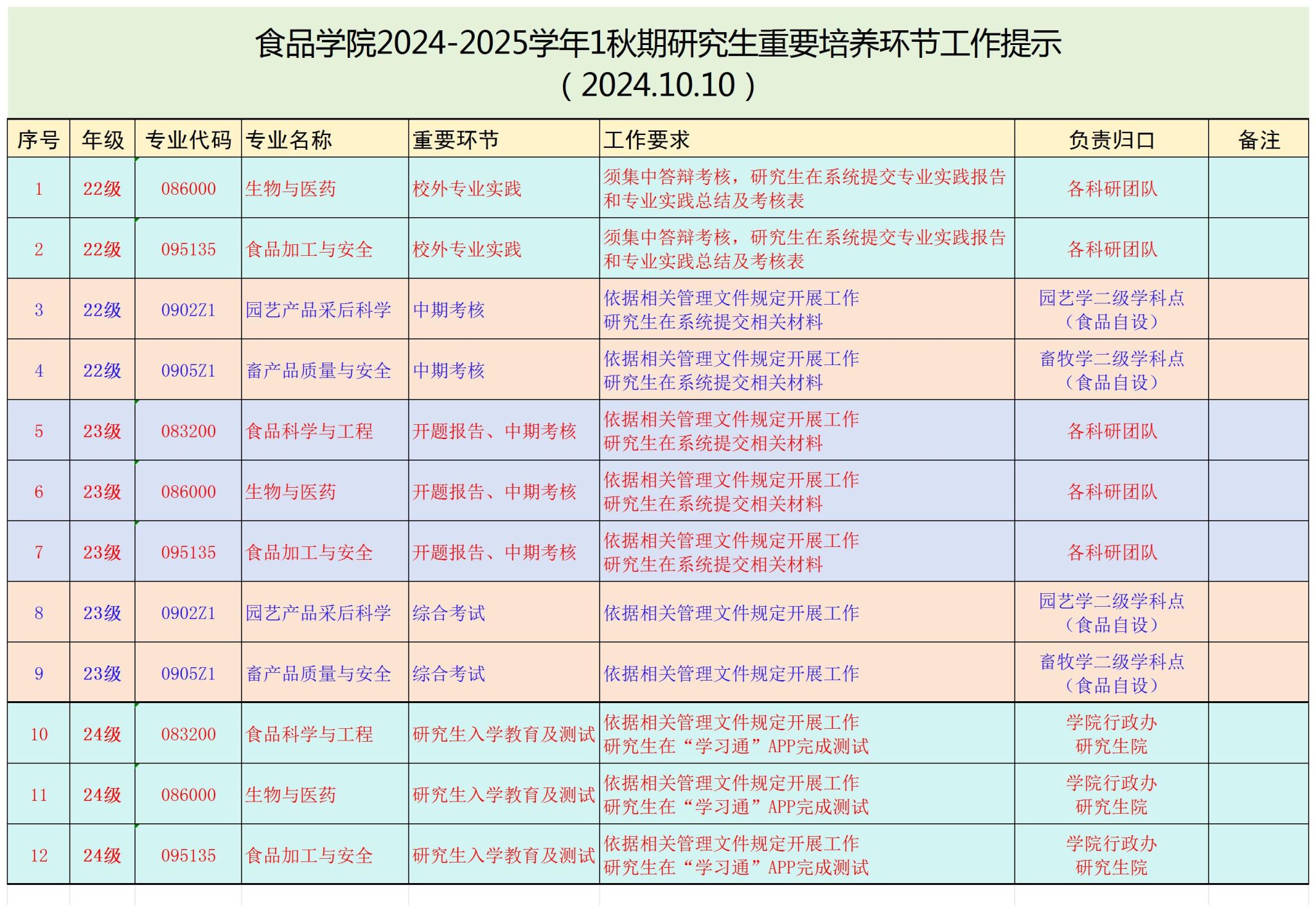 导航痕迹 tyc5997太阳集团 食品学院 首页 研究生教育 日常管理 正文 日常管理 招生信息 专业设置 培养方案 关于2024-2025学年秋期研究生须完成重要培养环节的提示 2024年10月10日 13:44 食品学院行政办公室 点击:[] 学院全体研究生: 根据tyc5997太阳集团《硕士研究生管理办法》(校研发〔2022〕25号)、《博士研究生管理办法》(校研发〔2022〕27号)、《进一步提升研究生学位论文质量管理办法(校研发〔2024〕5号)》、研究生培养环节文档质量抽检办法(试行)(研发〔2024〕3号)及研究生院相关通知规定要求,食品学院研究生2024-2025学年秋期须按要求完成系列重要培养环节(见下表)。 请大家提前做好准备工作,按期保质保量完成相关培养环节任务。 食品学院 2024年10月10日 上一条:学院2024年新“食”代“青葱学术”研究生论坛(第一期)圆满落幕 下一条:学院关于2024年研究生奖学金指标分配方案的通知 【关闭】