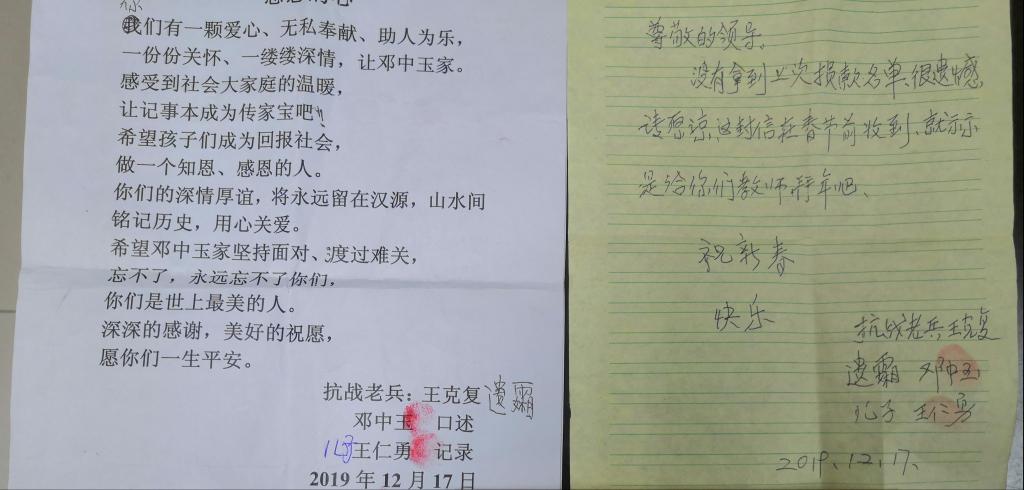 导航痕迹 tyc5997太阳集团 食品学院 首页 职工之家 正文 活动信息 食品学院工会和教代会收到一封特殊的感谢信 2019年12月19日 14:38 胡滨 点击:[] 近日,食品学院工会和教代会收到雅安市汉源县抗战老兵遗孀邓中玉女士的感谢信,由于受到疫情的影响,这封感谢信的到来相对较迟。在信中邓女士对我院教职工多年来对她的捐款资助表达了感谢。自2016年以来,我院教代会主席叶劲松教授了解到邓中玉女士生活较困难后,由院工会和教代会发起了“献爱心,铭记历史”专门针对邓女士的捐款资助活动。该活动每年都得到了广大教职工的积极响应,并且每年专程到汉源县对邓女士进行慰问。通过这项活动的开展,让广大教职员工铭记历史,砥砺前行。 上一条:食品学院工会组织教职工重走长征路 【关闭】
